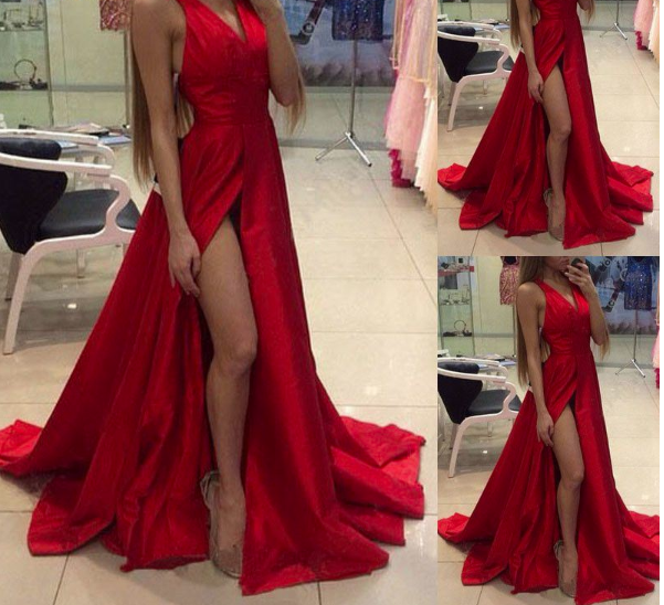 Red long velvet evening dress with a slit.