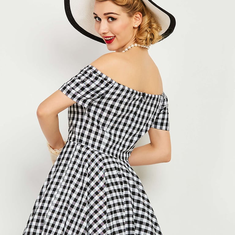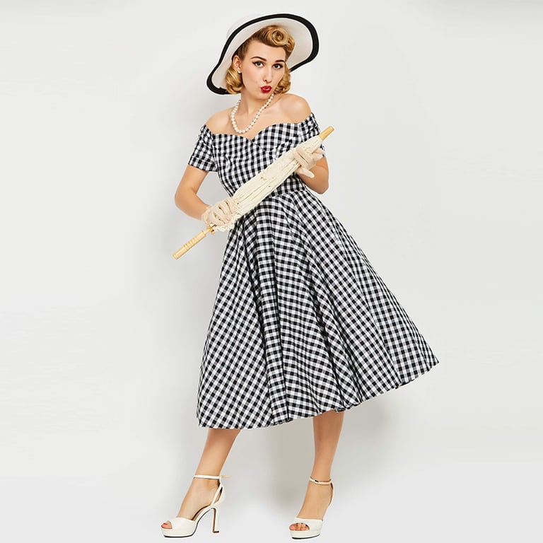 Retro checked women's dress for leisure time.