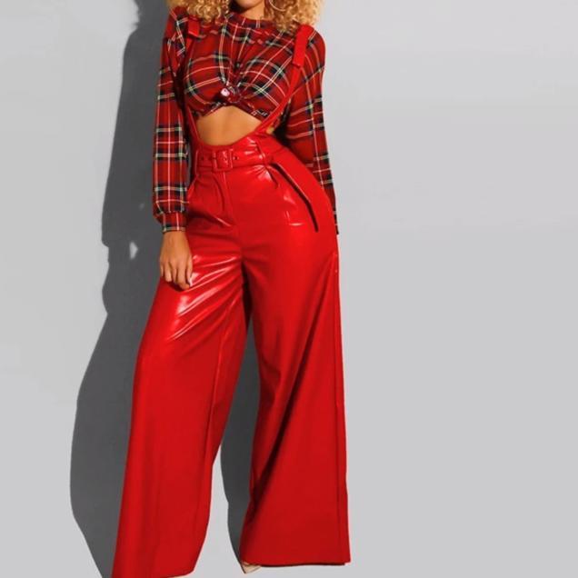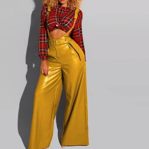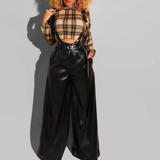 Faux leather trousers with wide legs feature fixed suspenders and a belt. The trousers are available in three basic colour options.