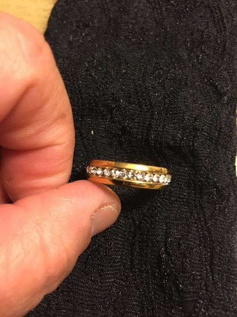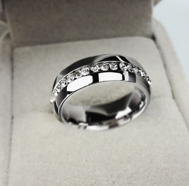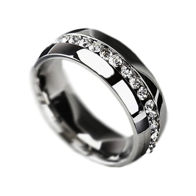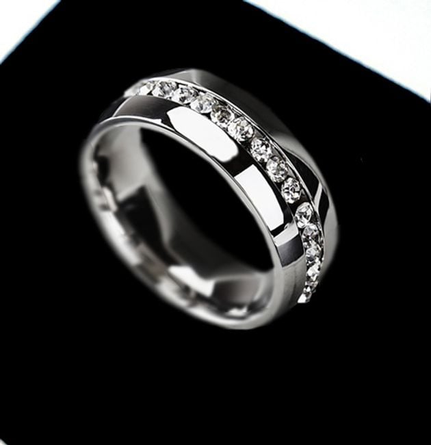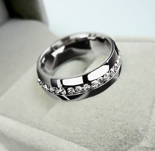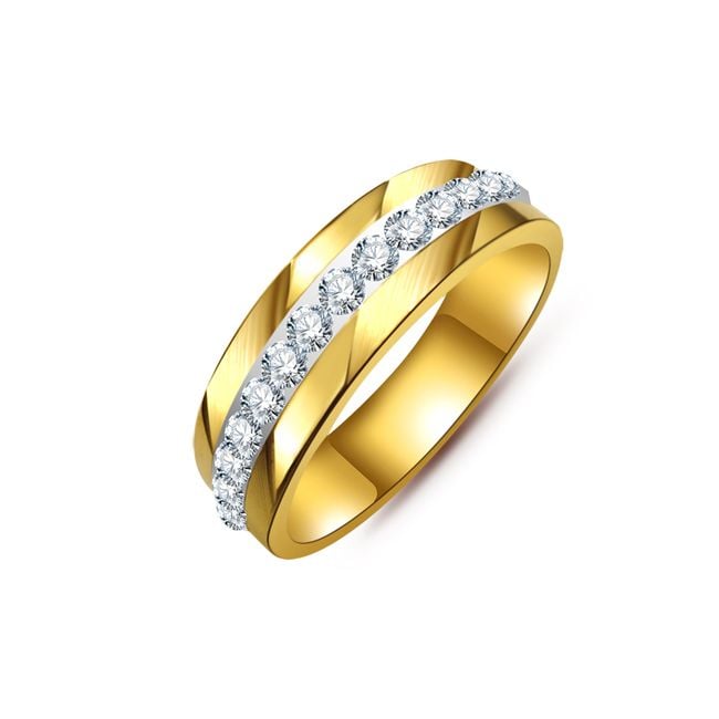 A simple elegant ring that is divided around the circumference by a thin line. This dividing line is made up of small stones. The ring is available in gold or silver colour and in several sizes.