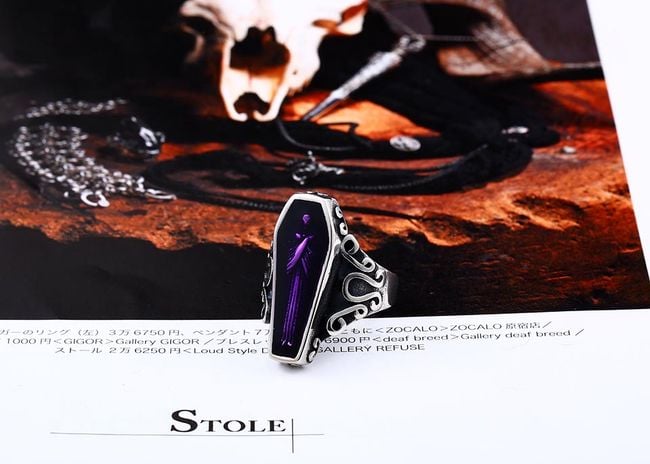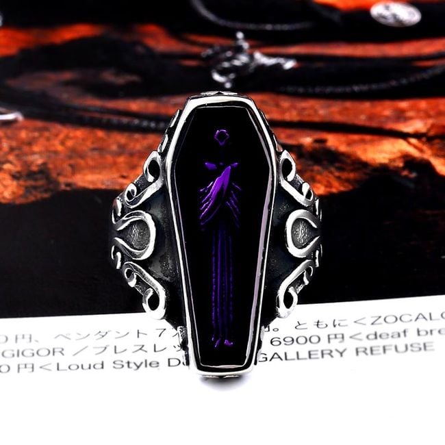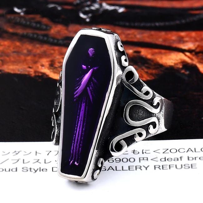 The imaginative ring is adorned with a colourful coffin. You can choose from two variants and several sizes.