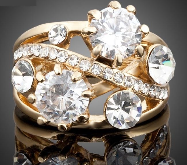 The ring is richly adorned with stones.