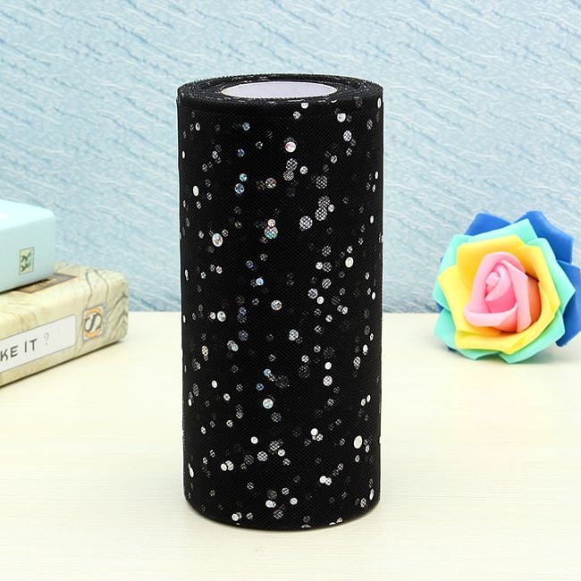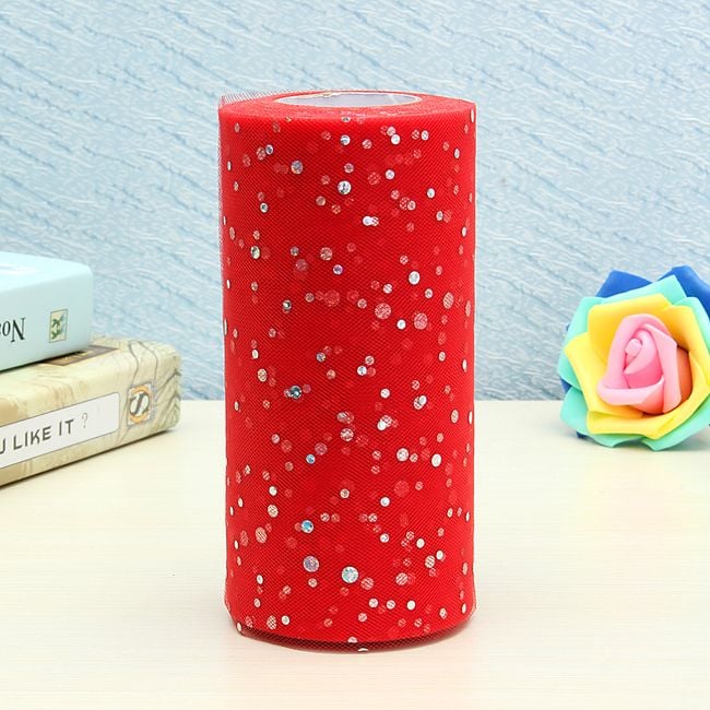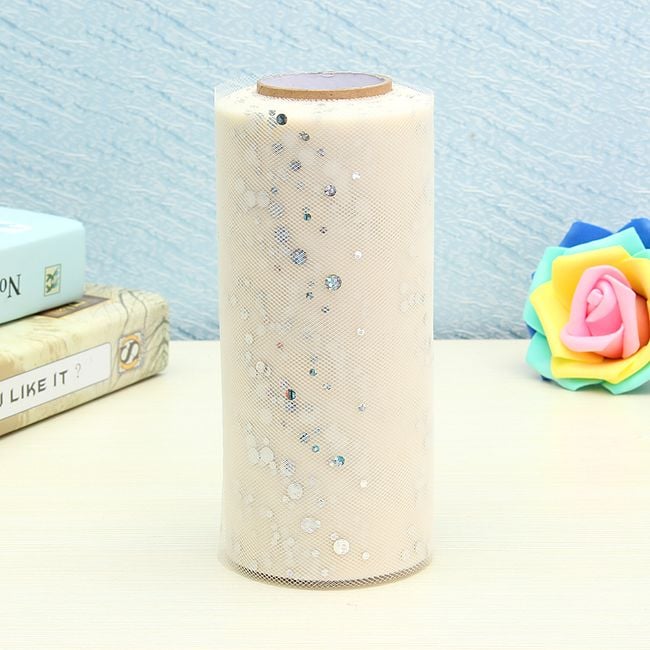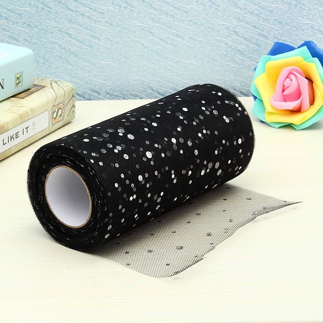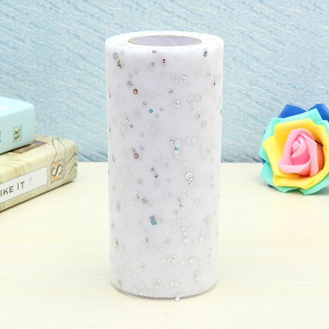 Tulle is suitable for decorating wedding and other spaces. It can be used for small arrangements on tables, chairs, flowers, and even cars. You can also sew dresses or skirts from tulle or create bows. The tulle is adorned with small sparkling stones.