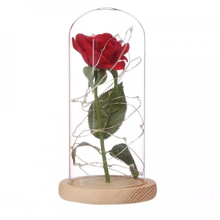 Romantic glass decoration with a red rose and LED lights. Wooden base. Powered by batteries. Also suitable as a gift.