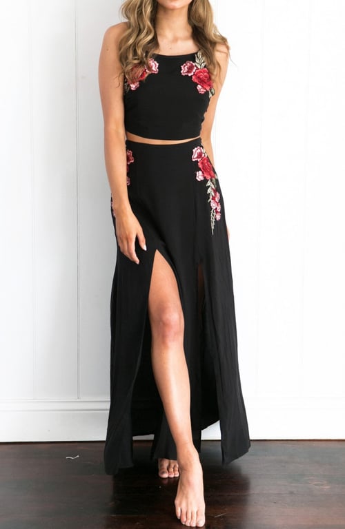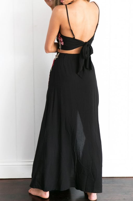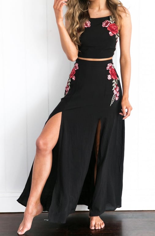 Women's dress consisting of a skirt and a top with floral embroidery. Top with ties. Skirt with slits.