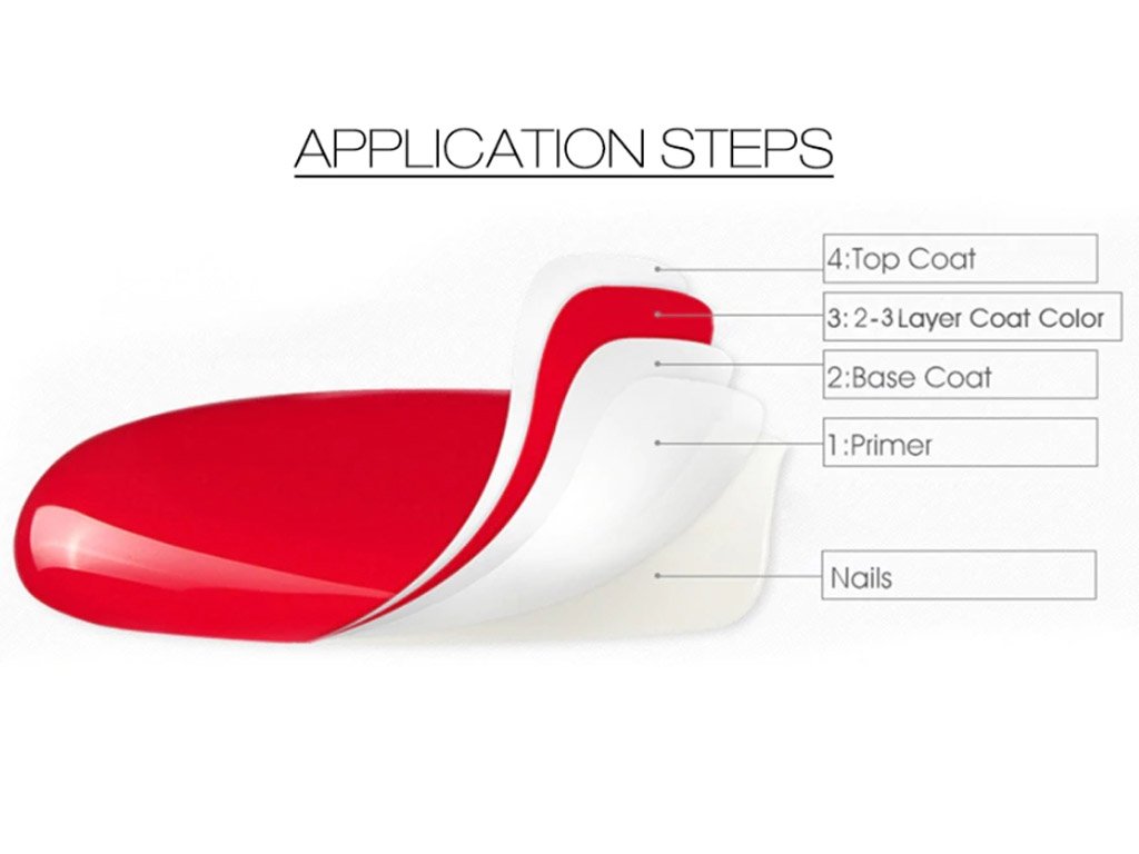 Option to purchase a Base Coat and a Top Coat for finishing protection. Apply the Base Coat gel polish to the prepared nail in a thin layer as a base before applying the coloured gel polishes, and after application, apply the Top Coat for finishing protection.