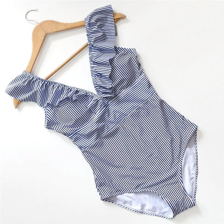 Women's one-piece swimsuit with a striped pattern. Straps and neckline adorned with ruffles. Available in multiple colour options.