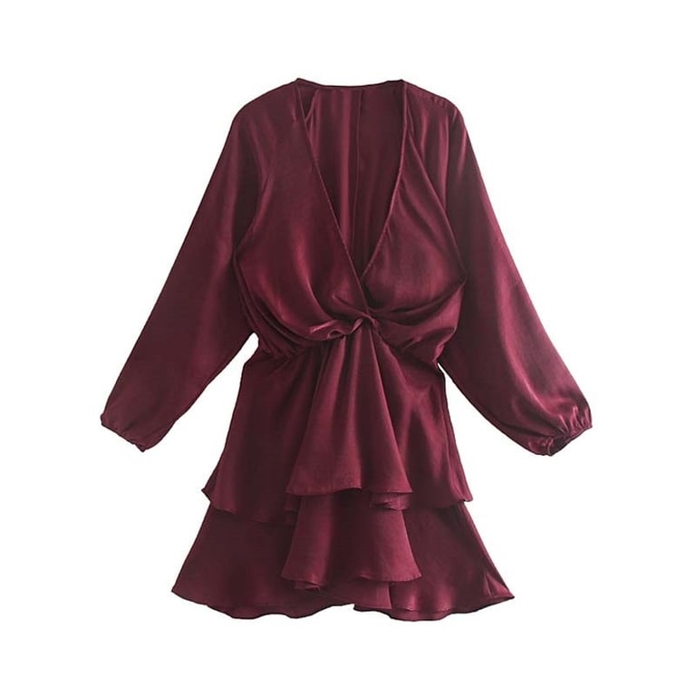 Women's evening dress with long sleeves and a ruffled skirt.