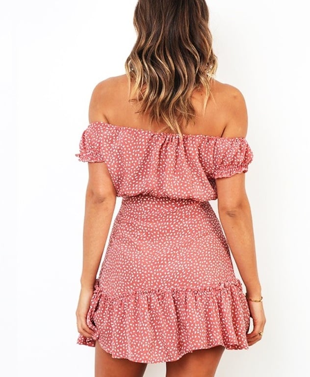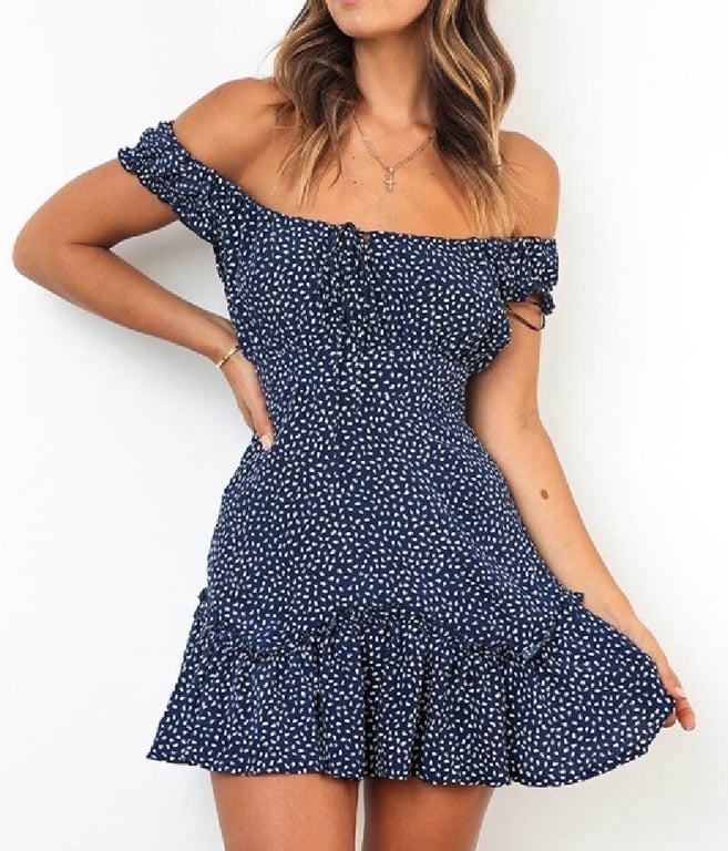 Romantic summer mini dress with ruffles and off-the-shoulder sleeves.
