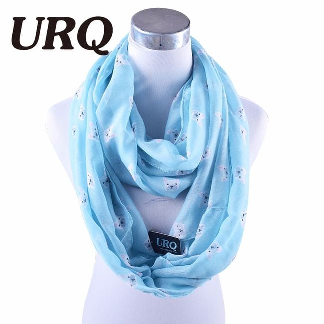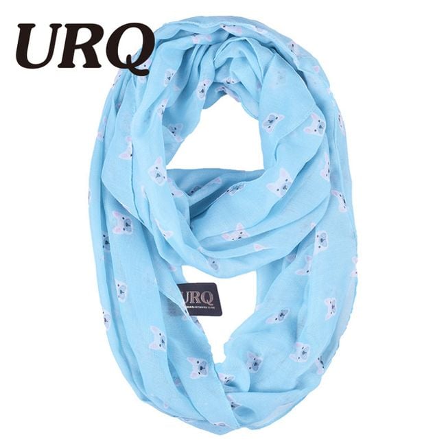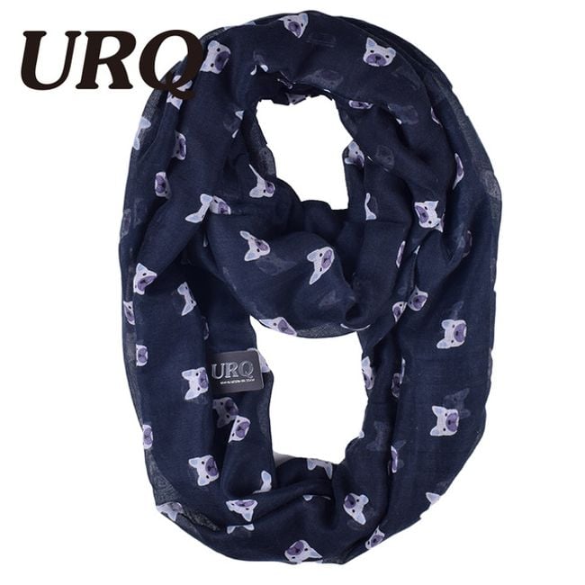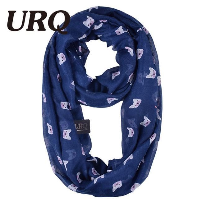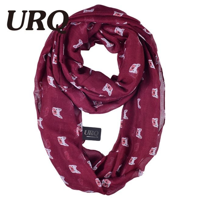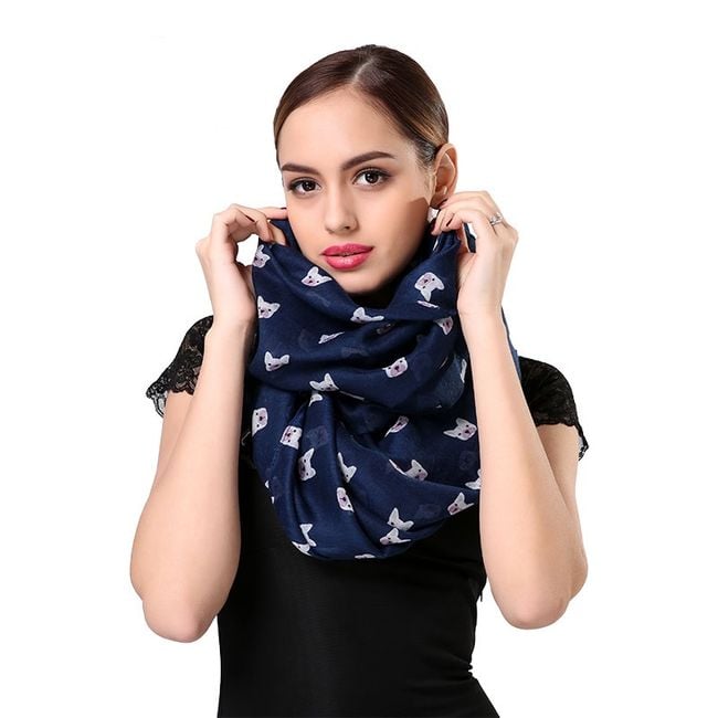 The scarf is decorated with a cute dog print. It serves as an accessory.