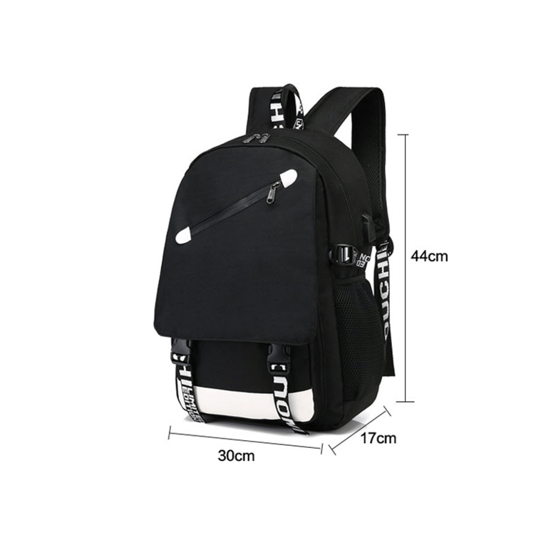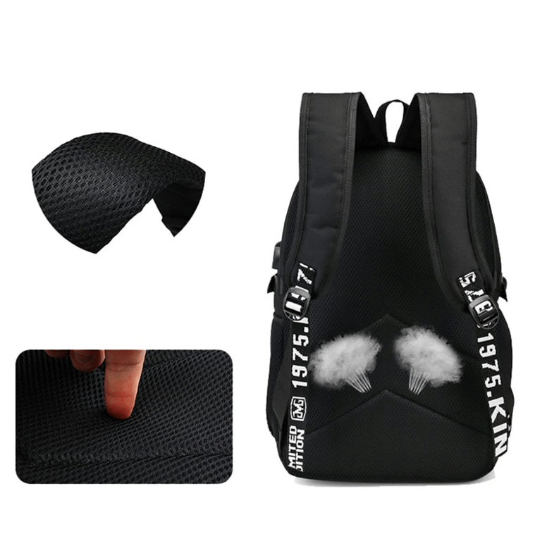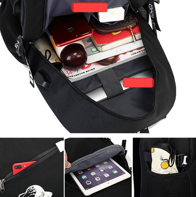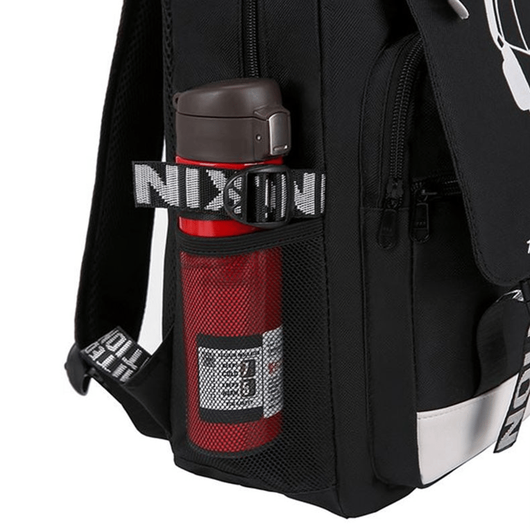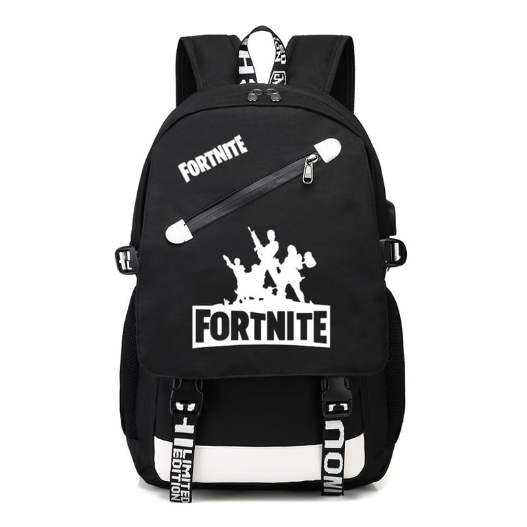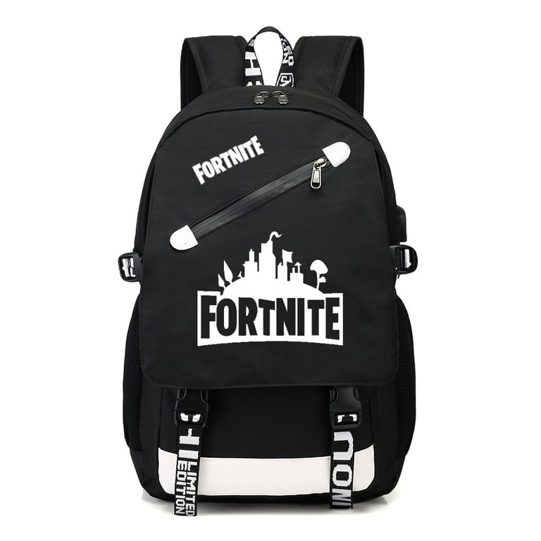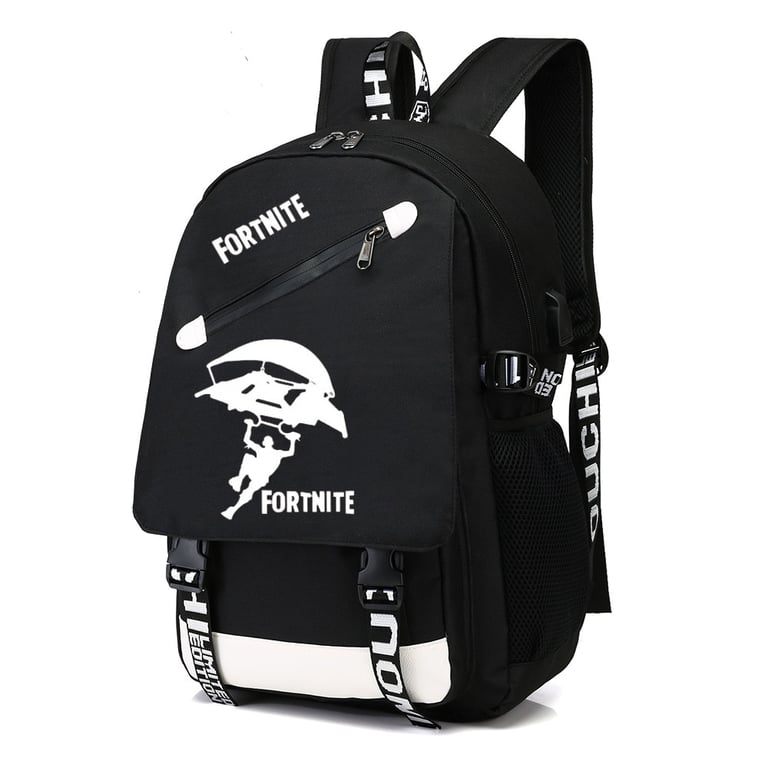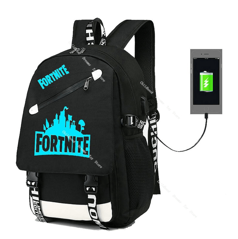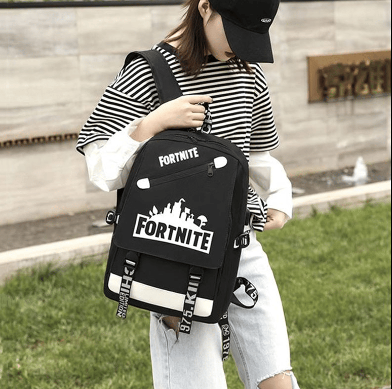 School backpack with USB and headphone access featuring Fortnite print