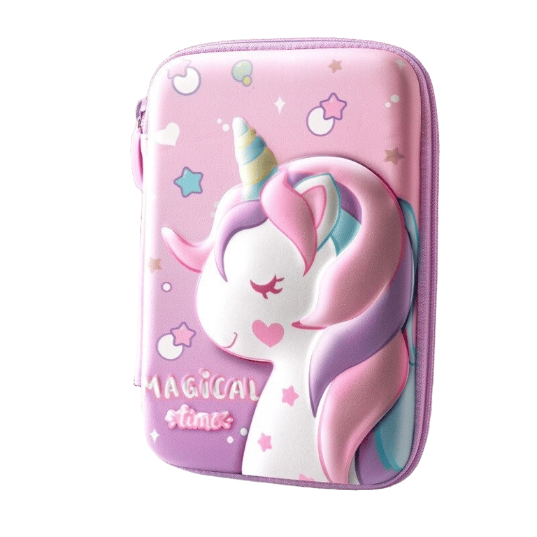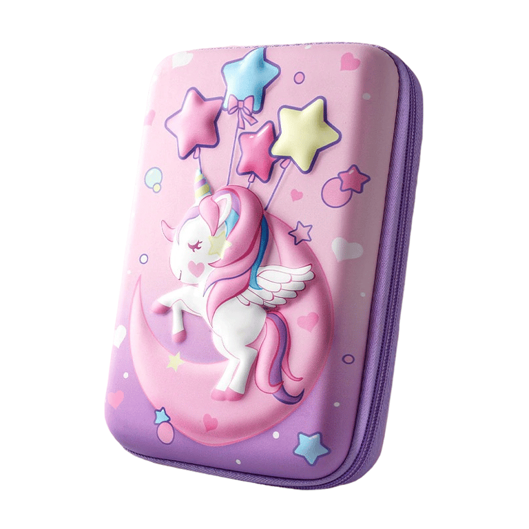 This pencil case featuring a unicorn design is perfect for school! It is made from durable EVA material and has plenty of space to store all your writing supplies. The case is lightweight and easy to carry, making it ideal for children going to school.