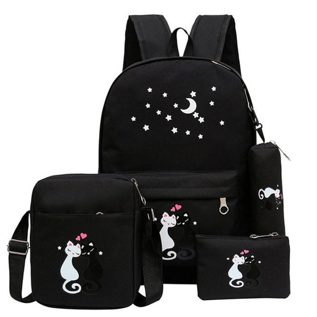 The set consists of a backpack, pencil case, handbag, and wallet, is solid-coloured, and features two love-struck cats.