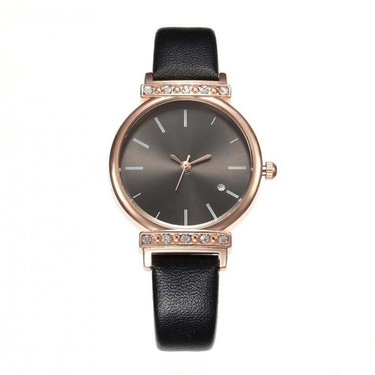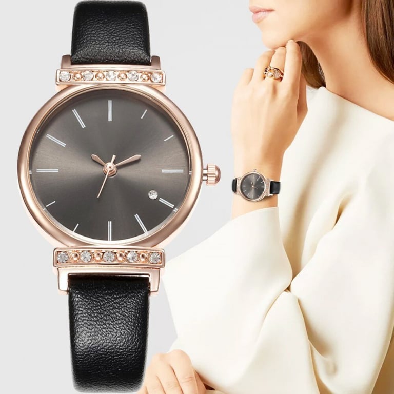 Women's watch with a leather strap. Dial without numbering in a metal frame with stones.