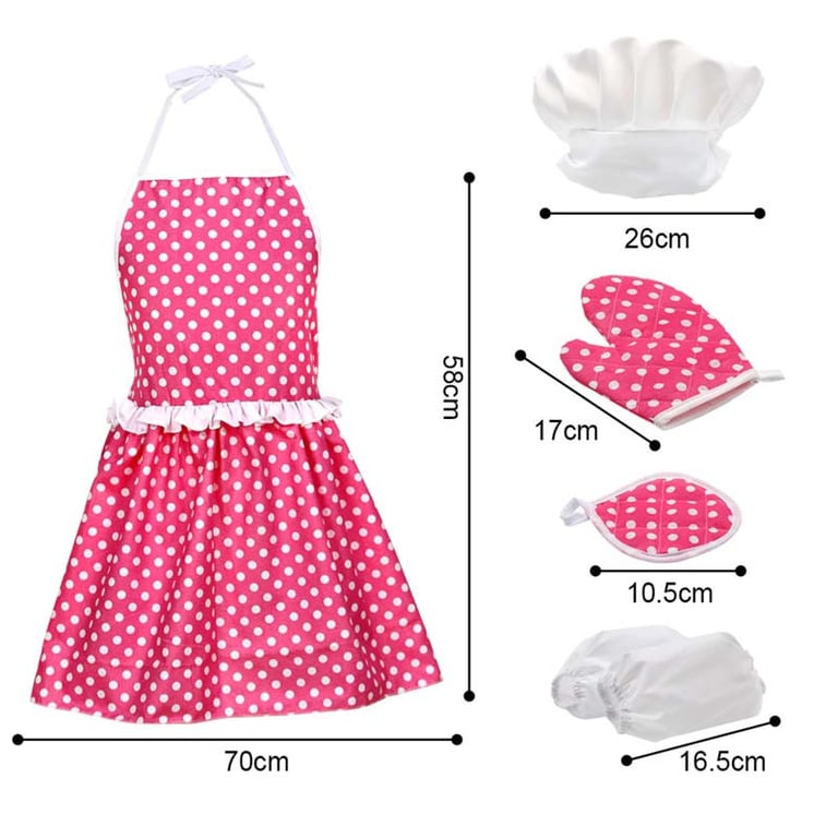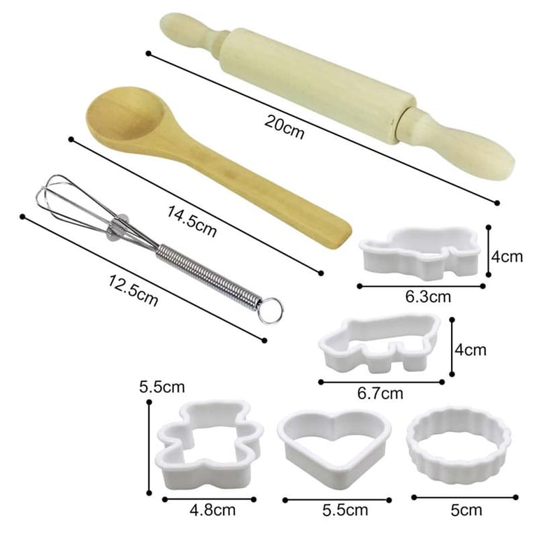 Contents: 1x apron, 1x chef's hat, 1x cloth, 1x glove, 1x spoon, 1x rolling pin, 1x whisk, 5x cookie cutter