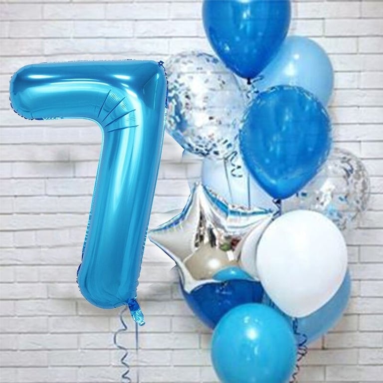 Contents of the package: 1x number balloon, 1x star balloon, 6x blue balloon, 2x white balloon, 2x confetti balloon
