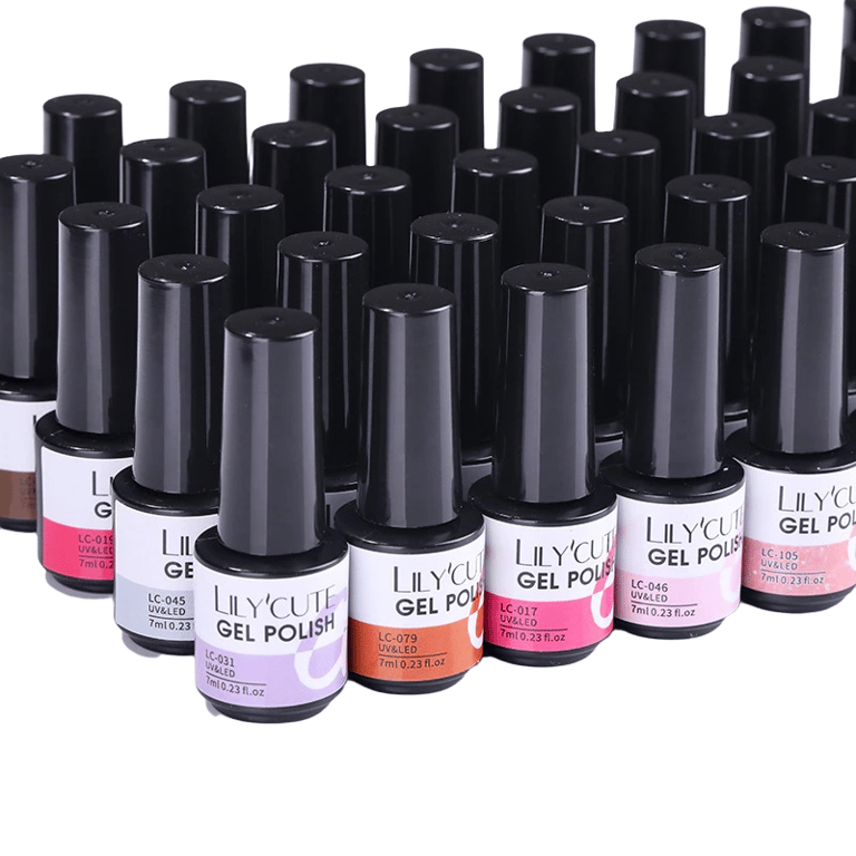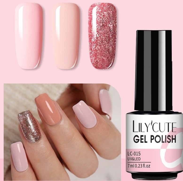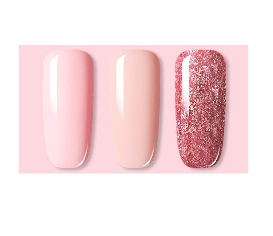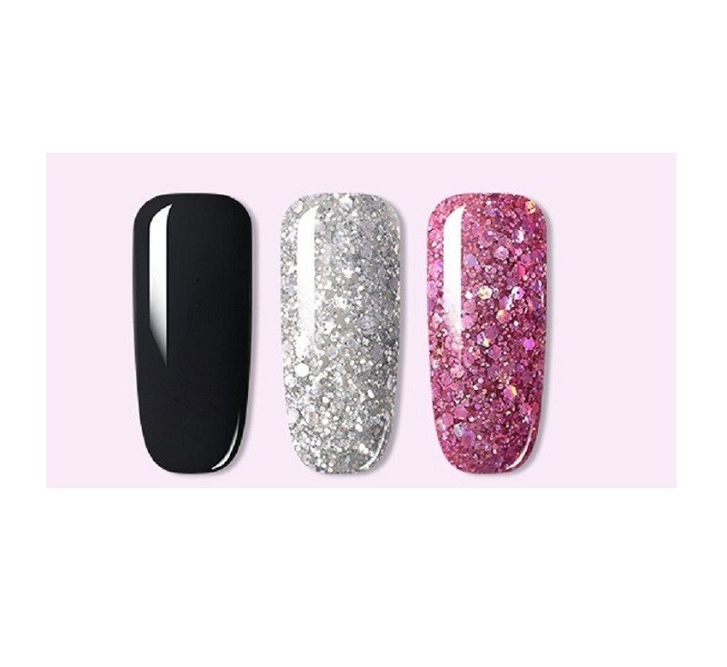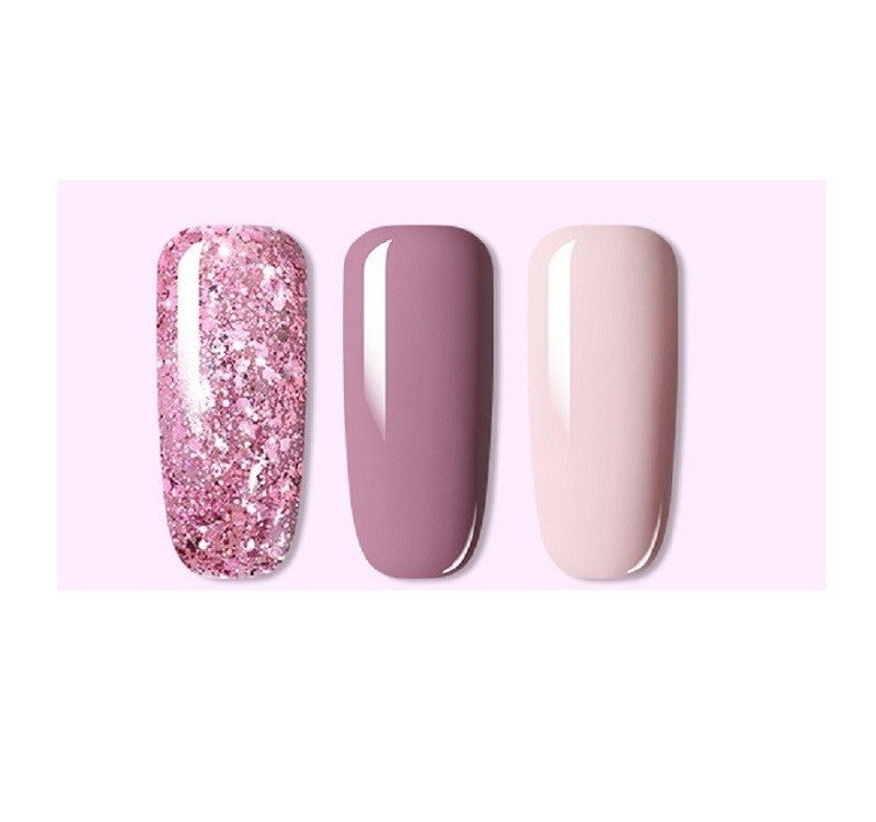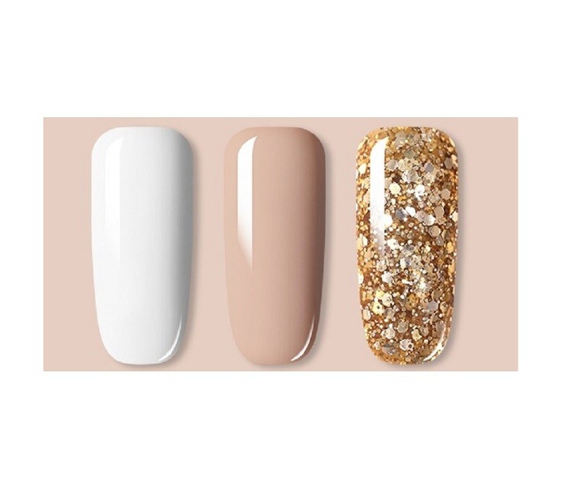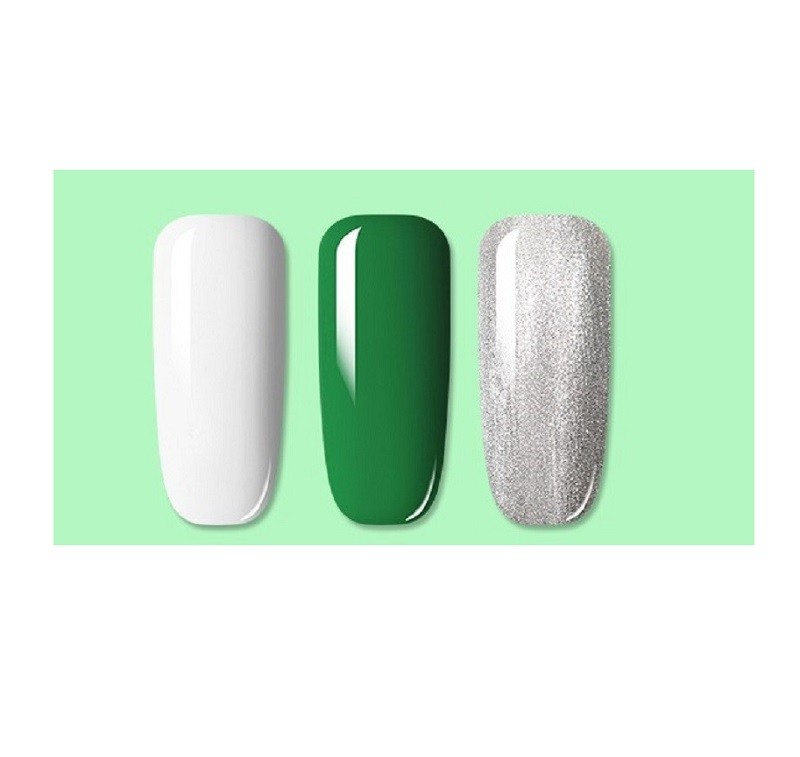 This set of gel polishes will help you achieve an amazing design for your hands. They dry quickly when using a UV lamp. The set includes 3 bottles in different shades. Each bottle has a volume of 7 ml.