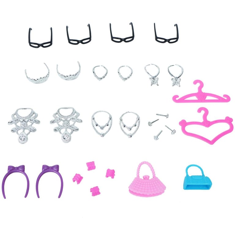 The package includes 10x shoes, 8x dresses, 8x necklaces, 4x glasses, 2x crowns, 2x bracelets, 2x earrings, 2x headbands, 2x hangers, 2x handbags.