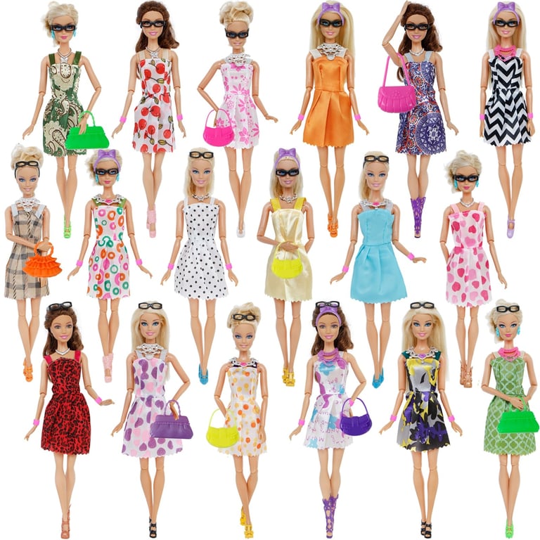 The package includes 10x shoes, 8x dresses, 8x necklaces, 4x glasses, 2x crowns, 2x bracelets, 2x earrings, 2x headbands, 2x hangers, 2x handbags.