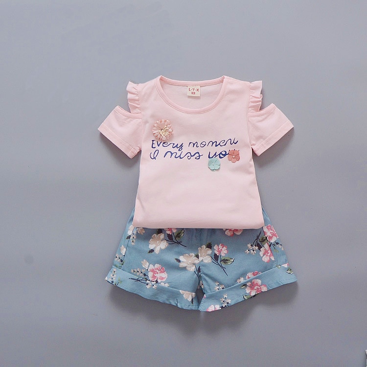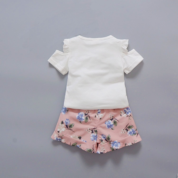 Girls' summer clothing set with a printed t-shirt and shoulder cut-outs