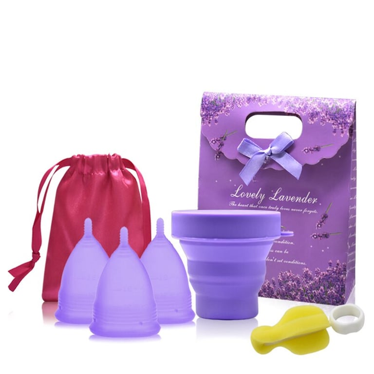 Practical set of 3 menstrual cups with a sterilisation bowl and a handy cleaning sponge.