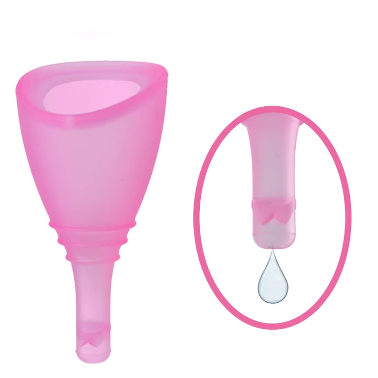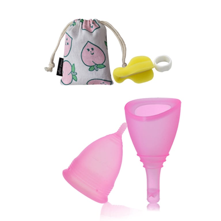 Practical set of 2 menstrual cups with a handy cleaning sponge and fabric pouch.