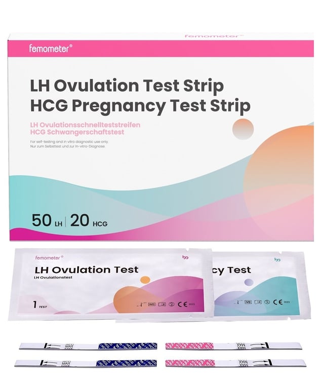 Ovulation test strips will help you predict the time of ovulation. They measure the presence of luteinising hormone (LH) in your urine. The package also contains pregnancy tests that have high sensitivity.