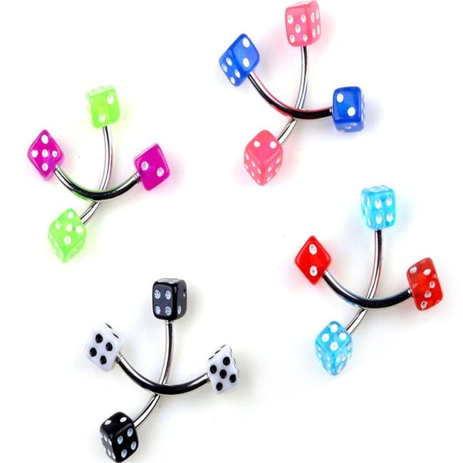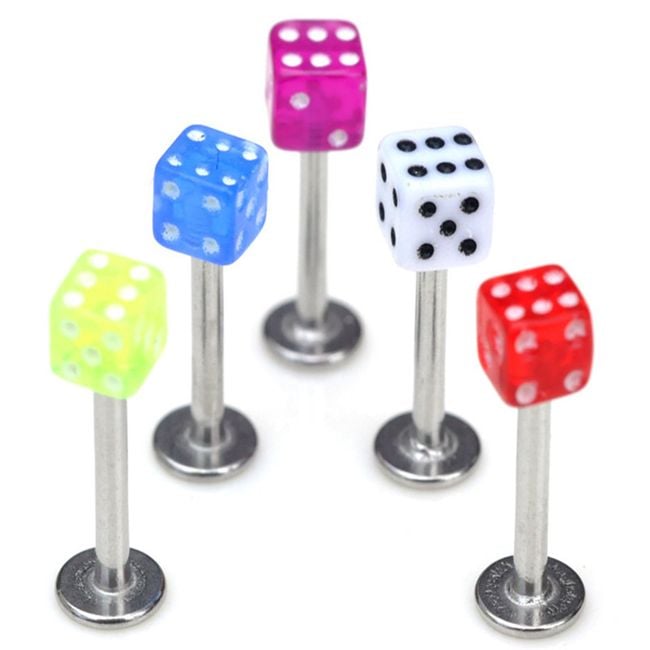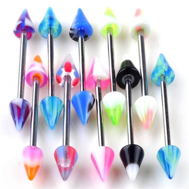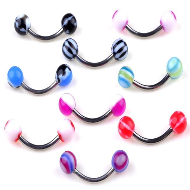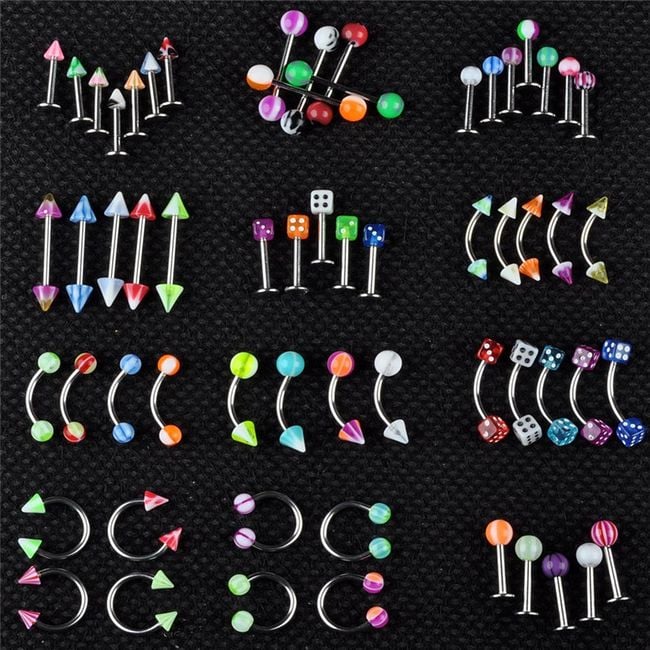 Set of piercings in various colours and shapes. It includes piercings for the nose, eyebrow, and lip.