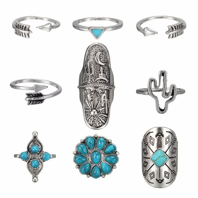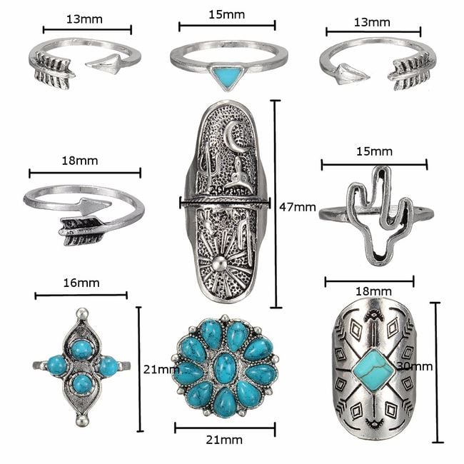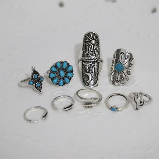 Adorn your hands with these original silver-coloured rings. The rings look very elegant and tasteful. You can mix and match them or wear them individually depending on your mood. Some of the rings are embellished with blue stones.