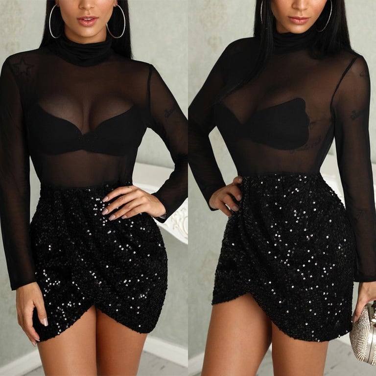 Sexy mini dress with a sheer top and an asymmetrical sequin skirt.