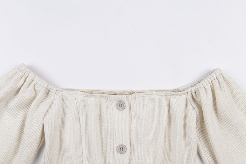• This crop-top features long balloon sleeves and is buttoned.