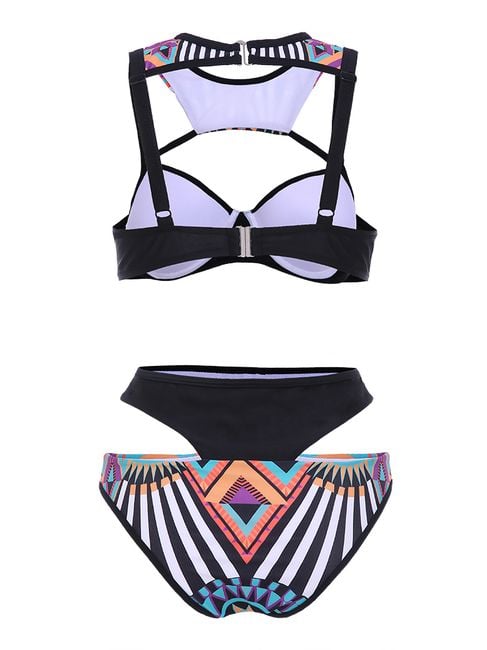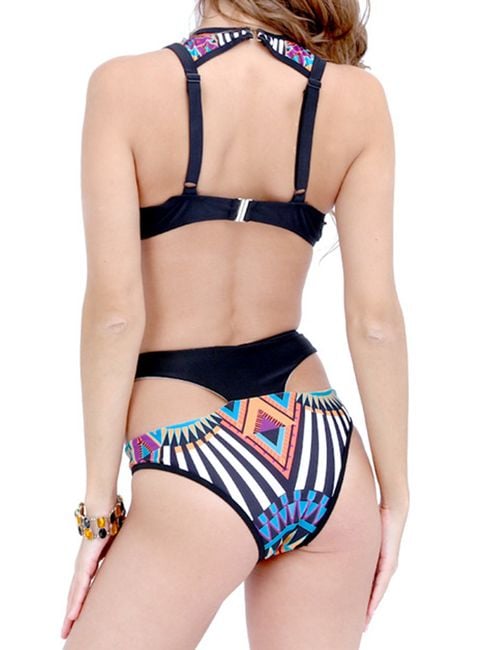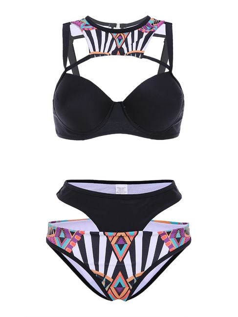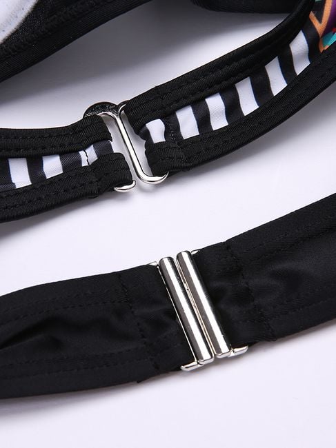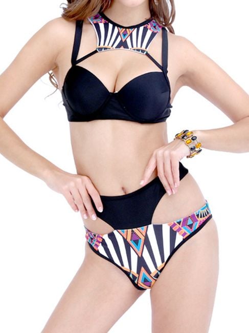 Are you looking for interesting swimwear for the summer? With these uniquely cut bikinis, you will definitely shine on any beach or by the pool. The basic black colour is complemented by various colourful geometric shapes, creating a perfect contrast. The unconventional cut will catch the attention of more than one man. The swimwear is available in four sizes. You can find the size chart in the product description.