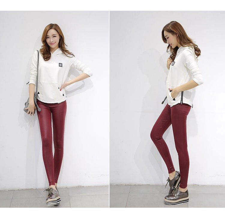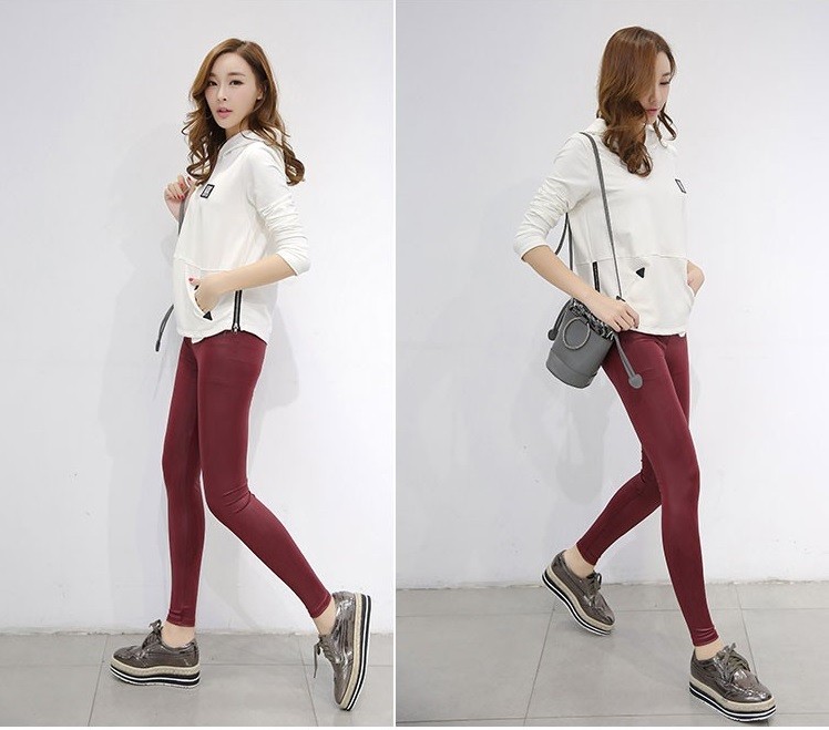Sexy women's leggings made of artificial leather perfectly accentuate the line of the legs.