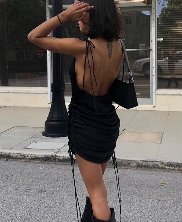 Women's black mini dress with adjustable drawstrings.