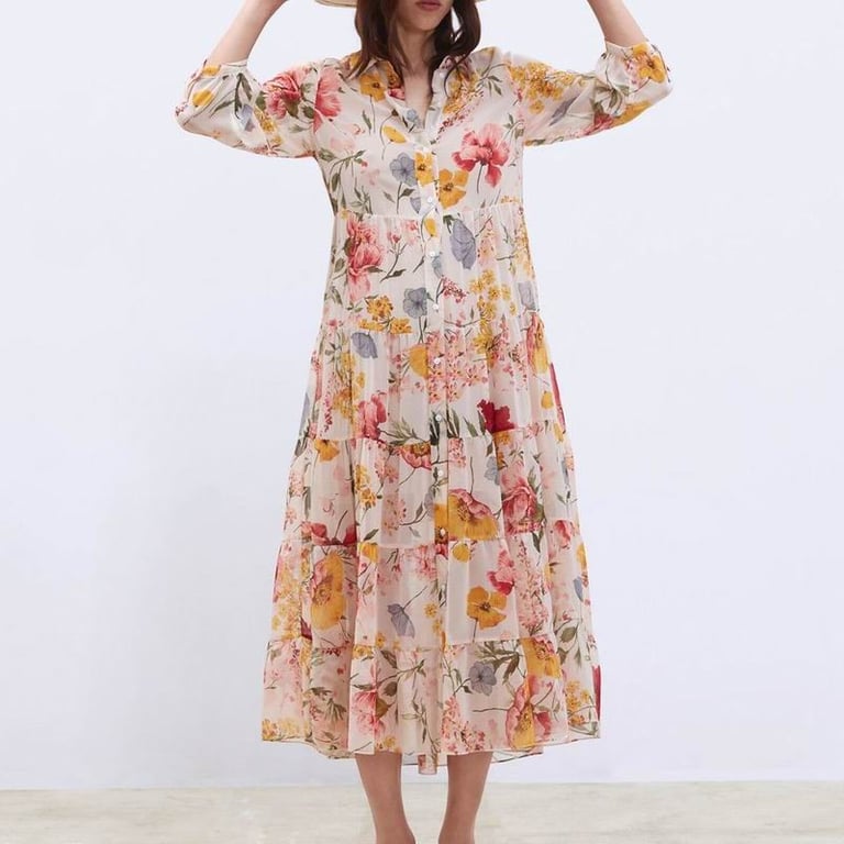Women's long-sleeve dress. Floral print and classic collar.