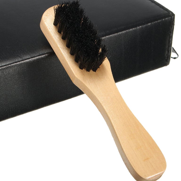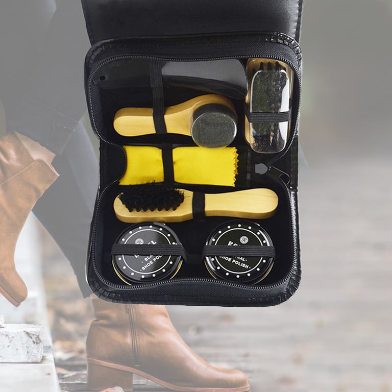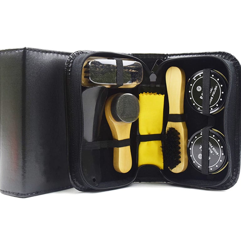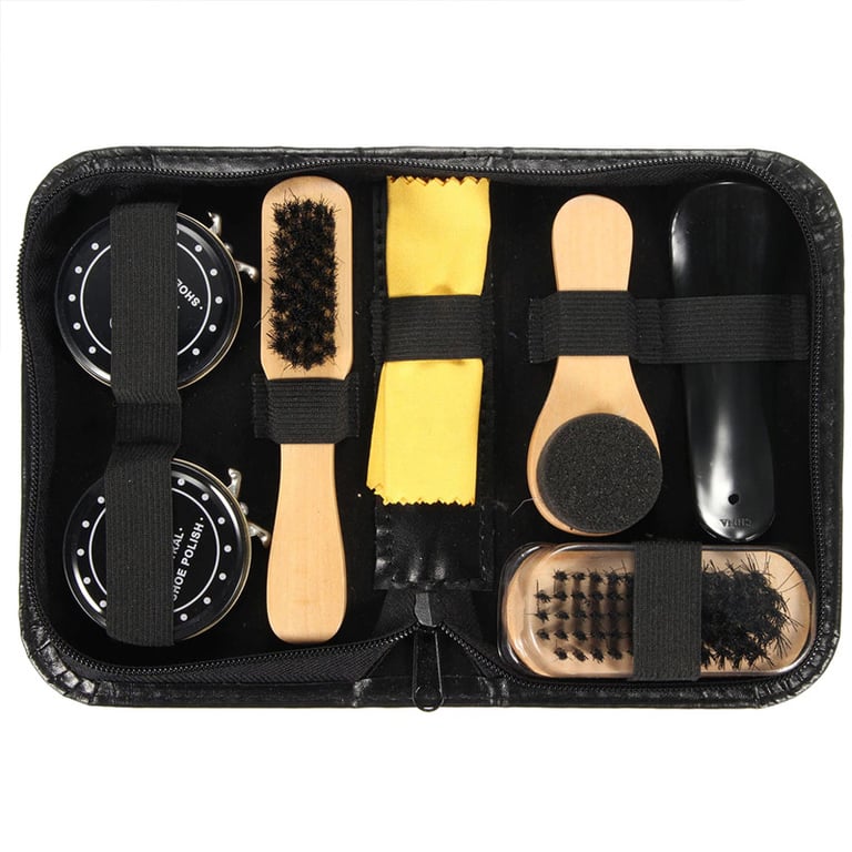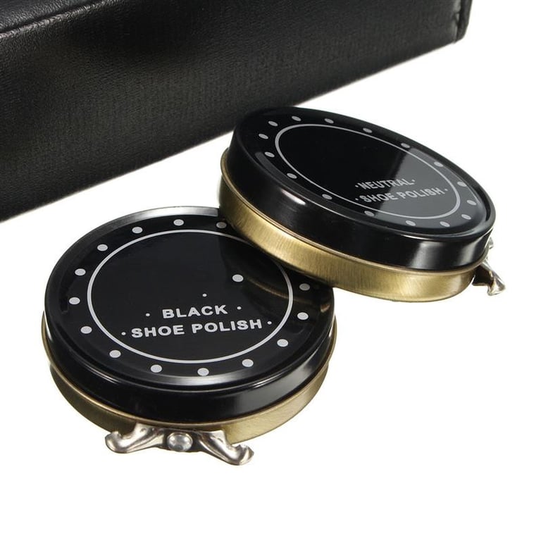 The package includes a practical bag, colourless polish, black polish, cloth, plastic spoon, sponge on a wooden handle, and 2 wooden brushes for removing dirt from shoes.