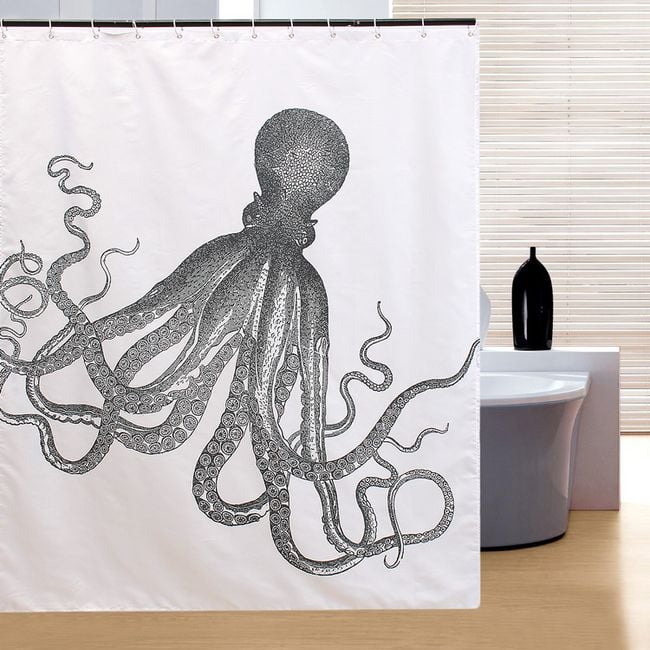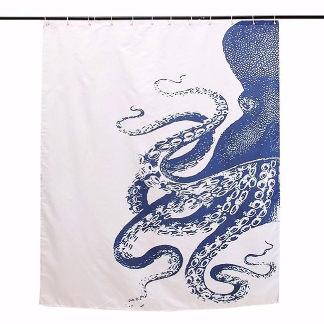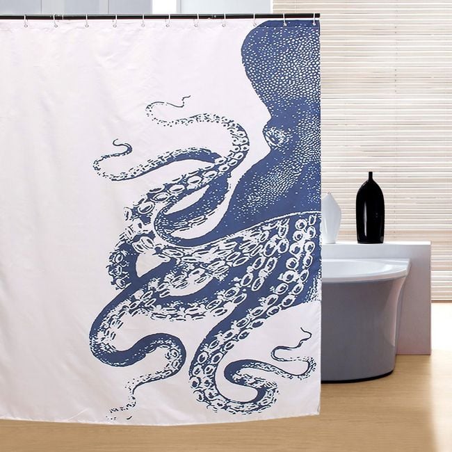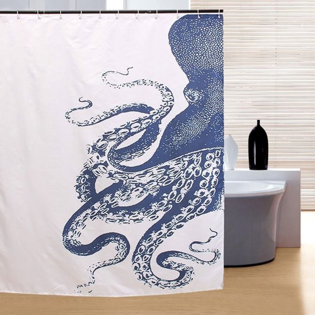 Do you love the secrets of the sea? The shower and bath curtain features a print of one of the most remarkable sea creatures – the octopus. Set a pleasant marine atmosphere in your bathroom. The curtain is made from soft and waterproof material. It includes 12 hooks for attachment, making installation very simple. The colourful image of the octopus is only on one side.
