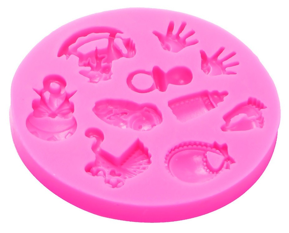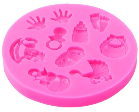 The moulds in the shape of a pacifier, stroller, and drinking bottle are perfect for decorating a cake.