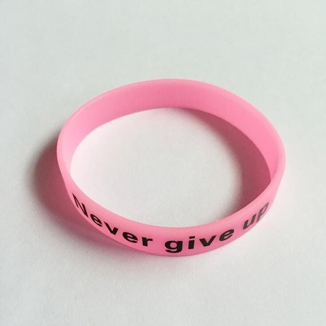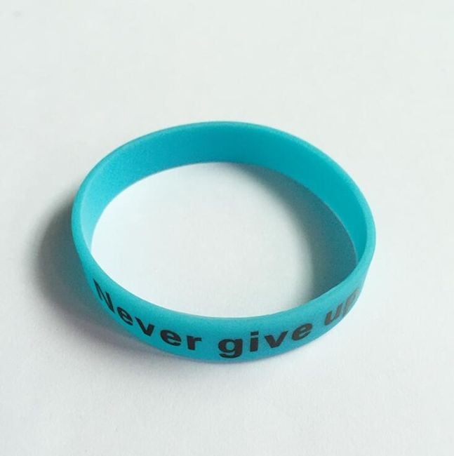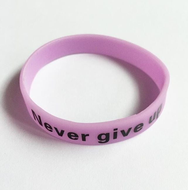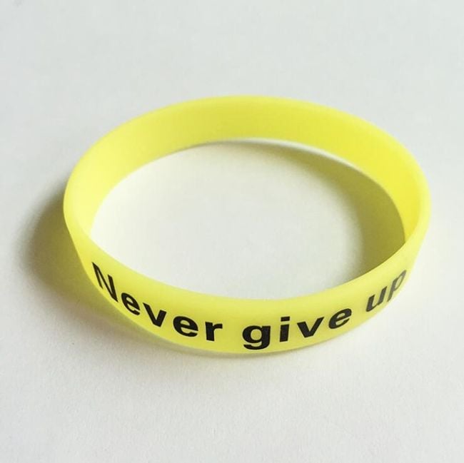The bracelet features the inscription "Never give up" and glows in the dark.