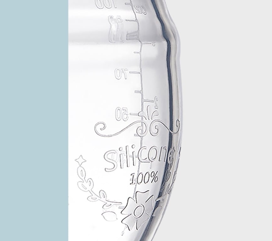 The bottle is decorated with a delicate design. The container has a practical measuring scale.