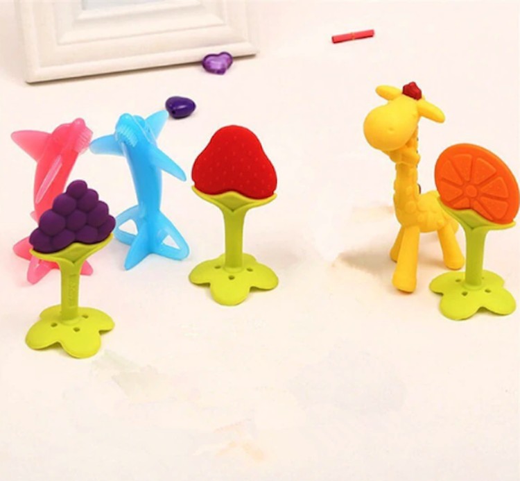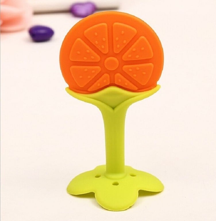 Children's teether in the shape of fruit made from very high-quality material. It helps children during the growth of their first teeth.
