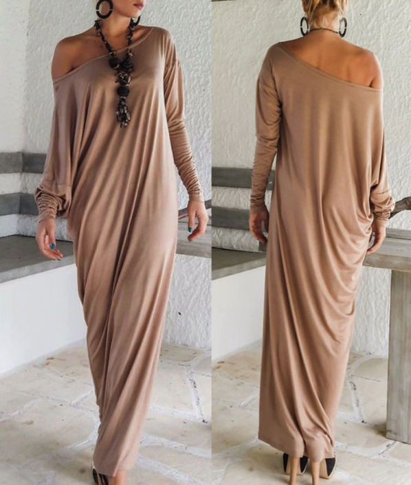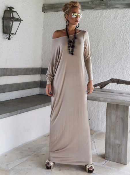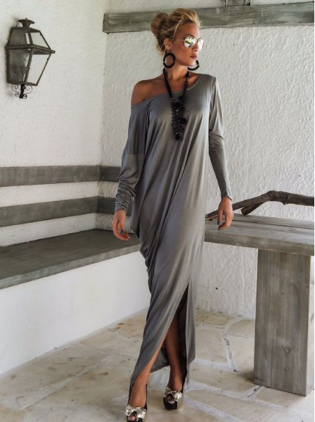 Simple asymmetrical floor-length evening dress.