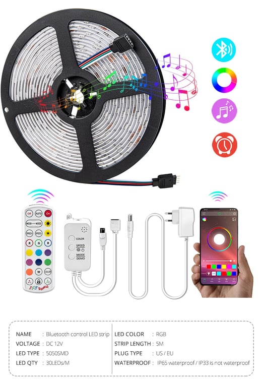 Smart LED strips with Bluetooth control and remote control – waterproof (SMD 5050)