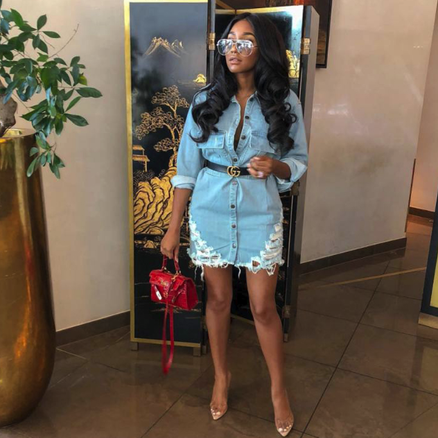Social denim ruched women's dress with a belt