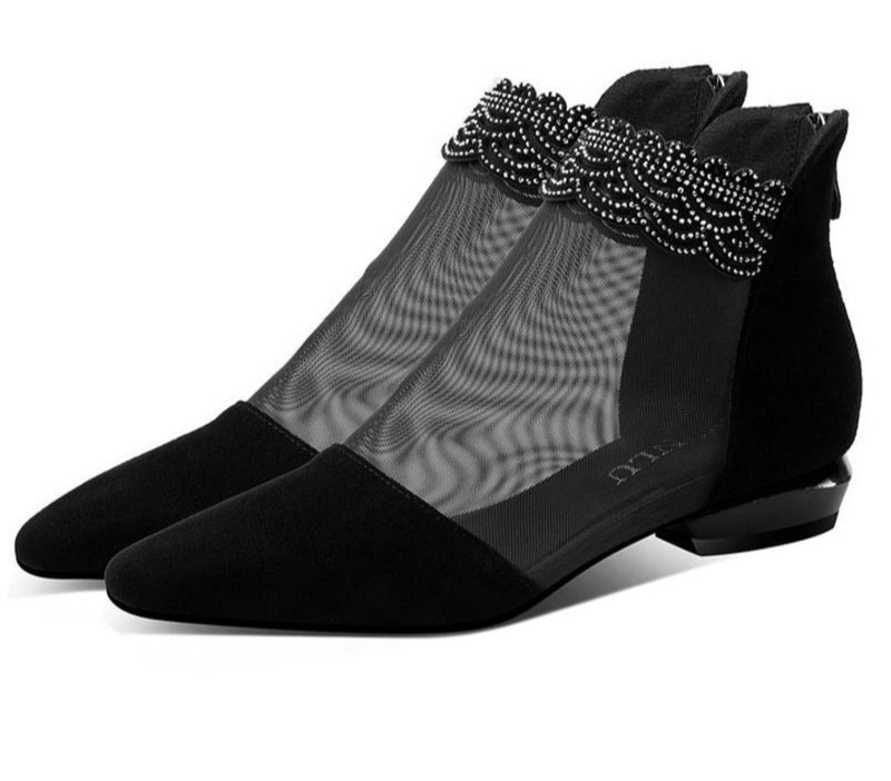 The shoes are pointed, ending at the ankle, and your instep is covered with mesh.
