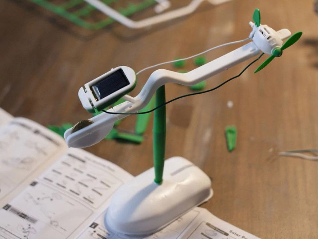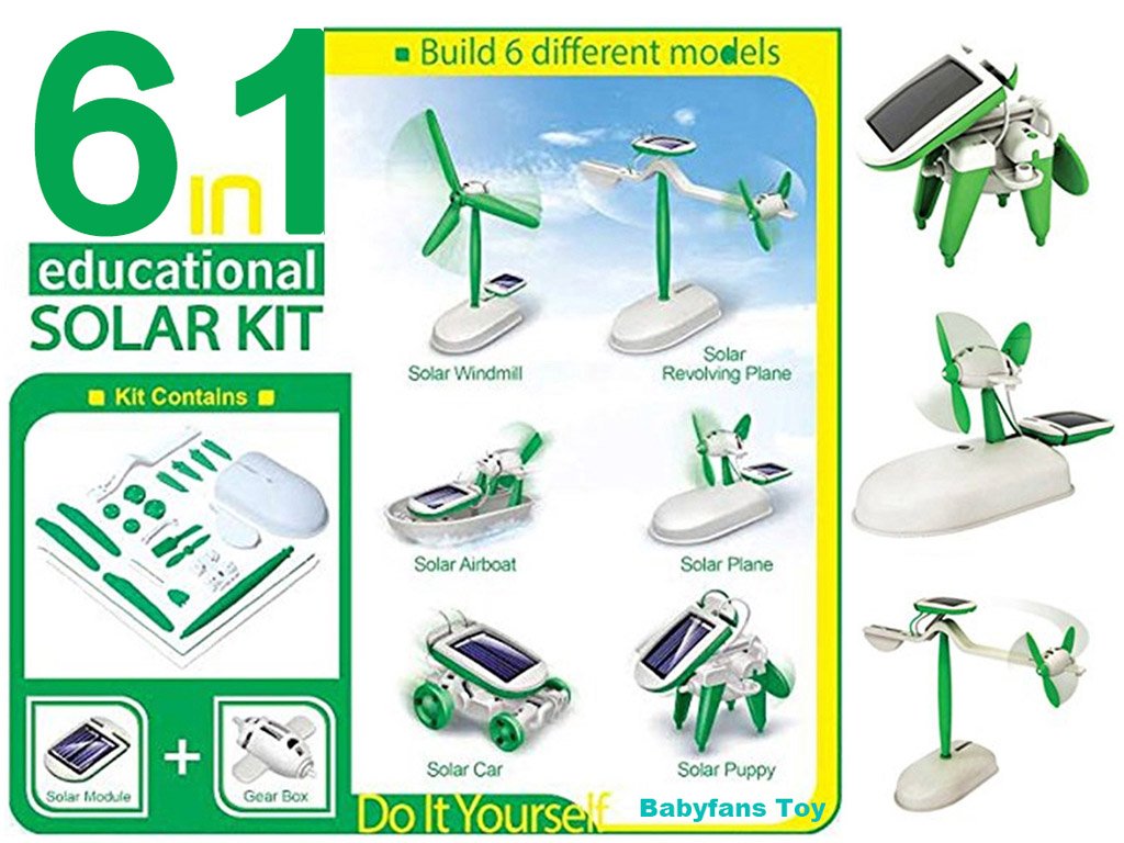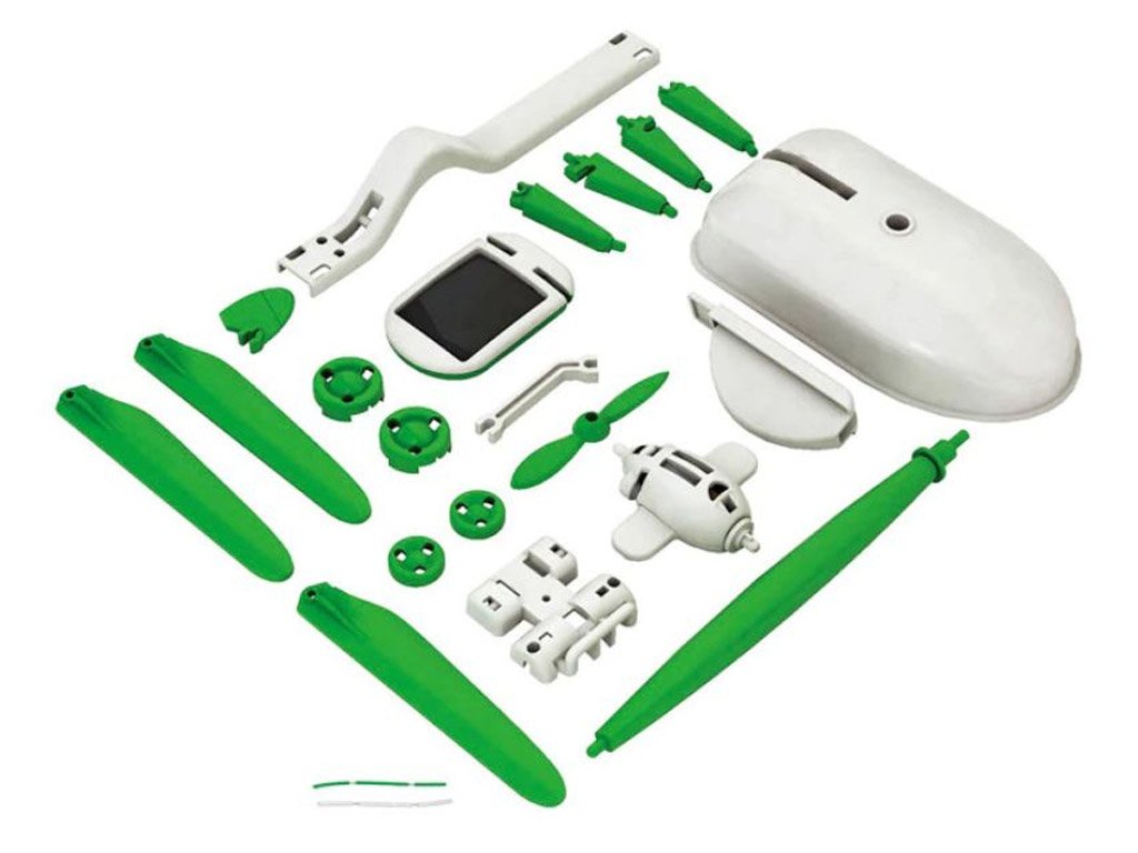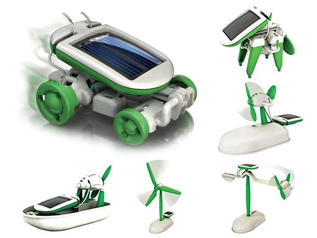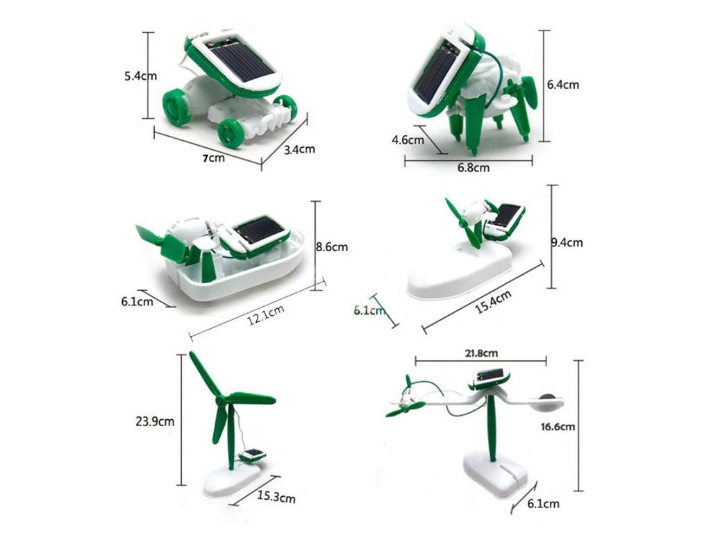 Choose from these 6 types of robots that can be built from this kit: wind turbine, flying airplane, plane, boat, car, and dog!