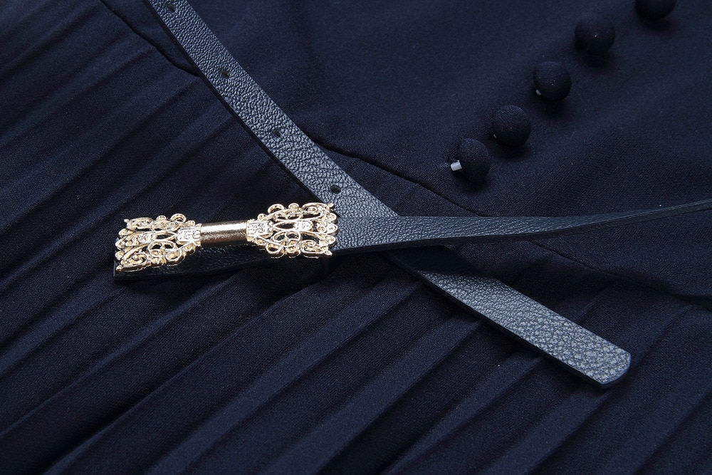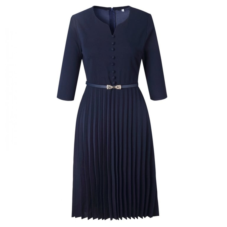 Elegant women's dress with sleeves. The bodice is adorned with buttons.
