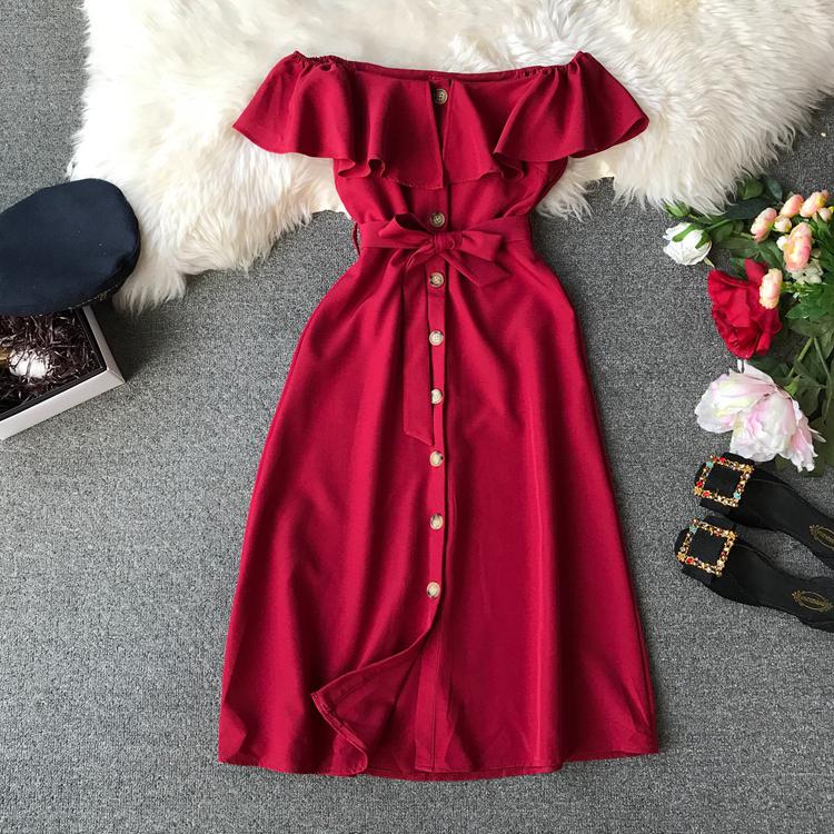 The dress features exposed shoulders and a decorative ruffle at the neckline.
