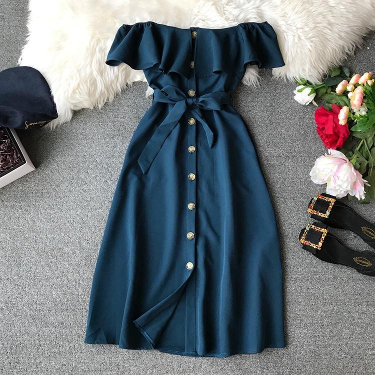 The dress features exposed shoulders and a decorative ruffle at the neckline.