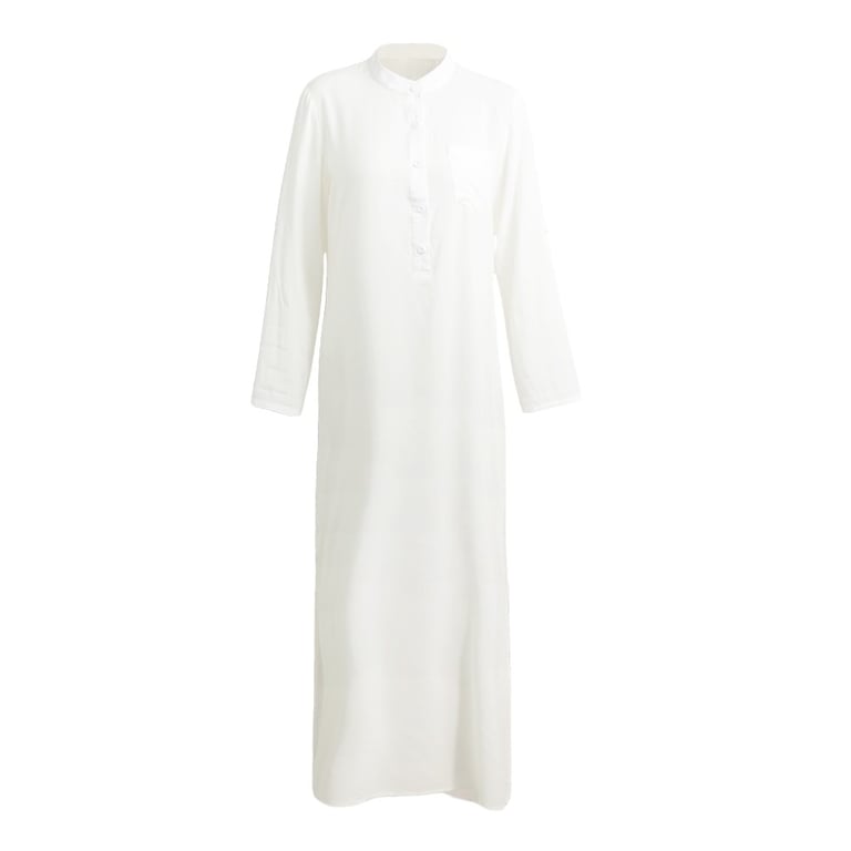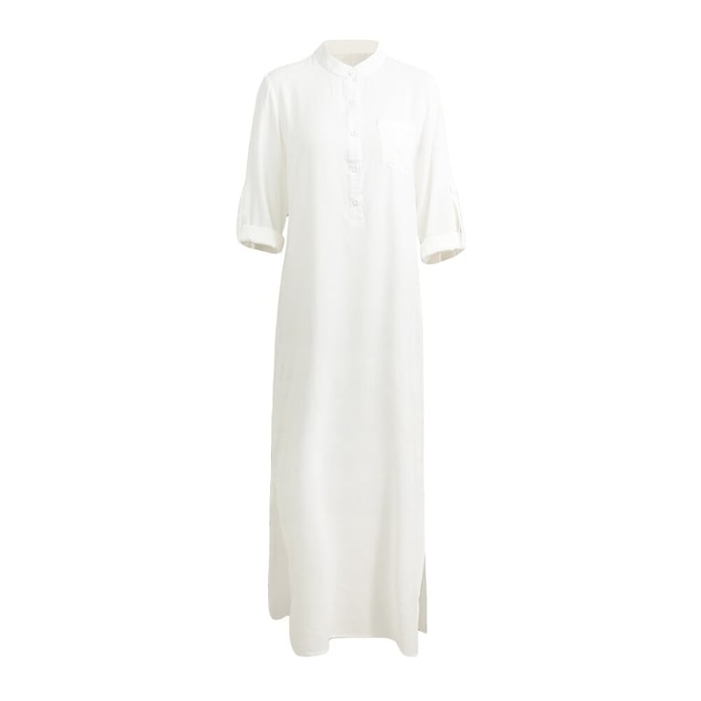 The dress features a V-neckline with buttons and long sleeves.